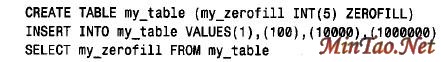 可对所有数值类型指定ZEROFILL 属性。它使相应列的显示值用前导零来填充,以达到显示宽度。在希望确定列值总是以给定的数字位数显示时可利用Z E R O F I L L。实际上,更准确地说是“一个给定的最小数目的数字位数”,因为比显示宽度更宽的值可完全显示而未被剪裁。使用下列语句可看到这一点: