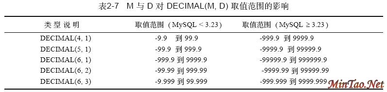 DECIMAL 类型不同于FLOAT和DECIMAL,其中DECIMAL 实际是以串存放的。DECIMAL 可能的最大取值范围与DOUBLE 一样,但是其有效的取值范围由M 和D 的值决定。如果改变M 而固定D,则其取值范围将随M 的变大而变大。表2 - 7的前三行说明了这一点。如果固定M 而改变D,则其取值范围将随D 的变大而变小(但精度增加)。表2 - 7的后三行说明了这一点。