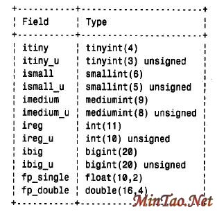 ,则输出的Field 和Type 列如下所示(注意,如果用MySQL的3.23 以前的版本运行这个查询,则有一个小故障, 即BIGINT 的显示宽度将是21而不是2 0。):