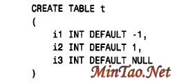itiny 和itiny_u两列都是T I N Y I N T列,并且都可取2 5 6个值,但是i t i n y的取值范围为-12 8 到127,而itiny_u的取值范围为0 到2 5 5。UNSIGNED 对不取负值的列是非常有用的,如存入人口统计或出席人数的列。如果用常规的有符号列来存储这样的值,那么就只利用了该列类型取值范围的一半。通过使列为U N S I G N E D,能有效地成倍增加其取值范围。如果将列用于序列号,且将它设为U N S I G N E D,则可取原双倍的值。在指定以上属性之后(它们是专门用于数值列的),可以指定通用属性NULL 或N O TNULL。如果未指定NULL 或NOT NULL,则缺省为NULL。也可以用D E FA U LT 属性来指定一个缺省值。如果不指定缺省值,则会自动选择一个。对于所有数值列类型,那些可以包含NULL 的列的缺省将为NULL,不能包含NULL 的列其缺省为0。下面的样例创建三个INT 列,它们分别具有缺省值-1、1和NULL: