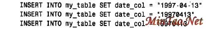 MySQL按表达式的环境将串和数自由地转换为日期和时间值,反之亦然。日期和时间值在数值上下文中转换为数;数在日期或时间上下文中转换为日期或时间。在将一个值赋予一个日期或时间列时,或在函数需要一个日期或时间值时,进行转换为日期或时间值的转换。如果表my_table 含有一个DATE 列date _ col,下列语句是等价的: