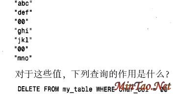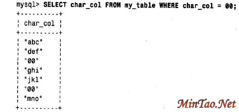 原来的打算大概是想删除包含值“0 0” 的那两行。但实际作用是删除了所有的行。之所以这样是由于MySQL的比较规则在起作用。char_col 为一个串列,但00 没有用引号括起来,因此,它被作为数对待了。按MySQL的比较规则,涉及一个串与一个数的比较按两个数的比较来求值。随着DELETE 查询的执行,char_col 的每个值被转换为0,”0 0”也被转换为0,因此,所有不类似数的串都转换成0。从而,对于每一行, WHERE 子句都为真,因此,DELETE 语句清空了该表。显然,这是一种在执行DELETE 前,应该用SELECT 语句对WHERE 子句进行测试的情况,这样将会示出表达式所选择的行太多了。如下所示: