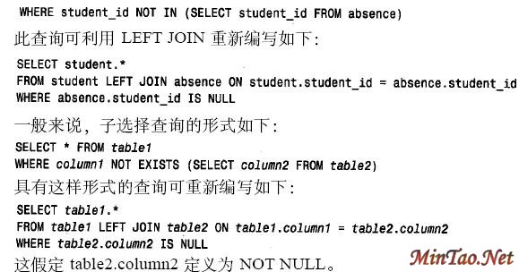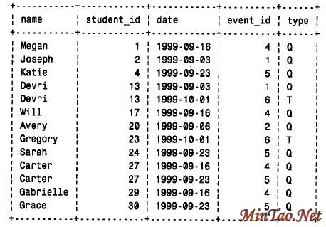 3.8 解决方案随笔 本节内容相当杂;介绍了怎样编写解决各种问题的查询。多数内容是在邮件清单上看到的解决问题的方案(谢谢清单上的那些朋友,他们为解决方案作了很多工作)。 3.8.1将子选择编写为连接 MySQL自3.24版本以来才具有子选择功能。这项功能的缺少是MySQL中一件常常令人惋惜的事,但有一件事很多人似乎没有认识到,那就是用子选择编写的查询通常可以用连接来编写。实事上,即使MySQL具有了子查询,检查用子选择编写的查询也是一件苦差事;用连接而不是用子选择来编写会更为有效。 1. 重新编写选择匹配值的子选择 下面是一个包含一个子选择查询的样例,它从score 表中选择所有测试的学分(即,忽略测验的学分): 可通过将其转换为一个简单的连接,不用子选择也可以编写出相同的查询,如下所示: 下面的例子为选择女学生的学分: 可将其转换为连接,如下所示: 这里是一个模式,子选择查询如下形式: 这样的查询可转换为如下形式的连接: 2. 重新编写选择非匹配值的子选择查询 另一种常用的子选择查询是查找一个表中有的而另一个表中没有的值。正如以前所看到的那样,“那些未给出的值”这一类的问题是LEFT JOIN 可能有用的一个线索。下面的查询包含一个子选择(它寻找那些全勤的学生): 3.8.2 检查表中未给出的值 我们已经在3 . 6节“检索记录”中看到,在要想知道一个表中哪些值不出现在另一表中时,可对两个表使用LEFT JOIN 并查找那些从第二个表中选中NULL 的行。并用下列两个表举例: 现在让我们来考虑一种更为困难的情况,“缺了哪些值”。对于第1章中提到的学分保存方案中,有一个列出学生的student 表,一个列出已经出现过的学分事件的event 表,以及列出每个学生的每次学分事件学分的一个score 表。但是,如果一个学生在某个测试或测验的同一天病了,那么score 表中将不会有这个学生的该事件的学分,因此,要进行测验或测试的补考。我们怎样查找这些缺少了的记录,以便能保证让这些学生进行补考?问题是要对所有的学分事件确定哪些学生没有某个学分事件的学分。换个说法,就是我们希望知道学生和事件的哪些组合不出现在学分表中。这就是我们希望LEFT JOIN 所做的事。这个连接不像前例中那样简单,因为我们不仅仅要查找不出现在单列中的值;还需要查找两列的组合。 我们想要的这种组合是所有学生/事件的组合,它们由student 表与event 表的叉积产生: FROM student, event 然后我们取出此连接的结果,与score 表执行一个LEFT JOIN 语句找出匹配者: FROM student, event LEFT JOIN score ON student.student_id = score.student.id AND event.event_id = score.event_id 请注意,ON 子句使得score 表中的行根据不同表中的匹配者进行连接。这是解决本问题的关键。LEFT JOIN 强制为由student 和event 表的叉连接生成的每行产生一个行,即使没有相应的score 表记录也是这样。这些缺少的学分记录的结果行可通过一个事实来识别,就是来自score 表的列将全是NULL 的。我们可在WHERE 子句中选出这些记录。来自score 表的任何列都是这样,但因为我们查找的是缺少的学分,测试score 列从概念上可能最为清晰: WHERE score.score IS NULL 可利用ORDER BY 子句对结果进行排序。两种最合理的排序分别是按学生和按事件进行,我们选择第一种: ORDER BY student.student_id, event.event_id 现在需要做的就是命名我们希望在输出结果中看到的列。最终的查询如下: SELECT student.name, student.student_id, event.date, event,event_id, event.type FROM student,event LEFT JOIN score ON student.student_id = score.student_id AND event.event_id = score.event_id WHERE score.score IS NULL ORDER BY student.student_id, event.event_id 运行此查询得出如下结果: 这里有一个问题要引起注意。此输出列出了学生的ID 和事件的ID。student_id 列出现在student 和score 表中,因此,开始您可能会认为选择列表可以给出student.student_id 或score . student _ id。但实际不是这样,因为能够找到感兴趣记录的基础是所有学分表字段返回NULL。选择score.student_id 将只在输出中产生NULL 值的列。类似的推理可应用到event_id 列,它也出现在event 和score 表中。 3.8.3 执行UNION 操作 如果想通过从具有相同结构的多个表中建立一个结果集,可在某些数据库系统中使用某种UNION 语句来实现。MySQL没有UNION(至少直到3 . 2 4版还没有),但有许多办法来解决这个问题,下面是两种可行的方案: ■ 执行多个SELECT 查询,每个表执行一个。如果不关心所选出行的次序,这样做就行了。 ■ 将每个表中的行选入一个临时存储表,然后选择该表的内容。这样可对行按所需的次序进行排序。在MySQL3.23版及以后的版本中,可通过允许服务器创建存储表来解决这个问题。而且,还可以使该表为临时表,以便在您与服务器的会话结束时,自动删除该表。 在下面的代码中,我们明确地删除该表使服务器释放与其有关的资源。如果客户机会话将继续执行进一步的查询,这样做很有好处。为了取到更好的性能,还可以利用HEAP(在内存中)表。 对于3 . 2 3版本,除了必须自己明确定义hold_tbl 表中的列外,其想法是类似的,而且结尾处的DROP TABLE 是强制性的,用来防止在以下客户机会话生命周期之后继续存在: 3.8.4 增加序列号列 如果用ALTER TABLE 增加AUTO_INCREMENT 列,则该列用序列号自动地填充。下面这组mysql会话中的语句示出了怎样创建一个表,在其中存放数据,然后增加一个AUTO_INCREMENT 列: 3.8.