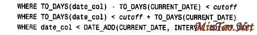 其中第一行不能利用索引, 因为必须为每行检索列, 以便能够计算TO _ DAYS(date_col) 的值。第二行要好一些。c ut o ff 和TO _ DAY S ( CURRENT _ DATE) 两者都是常量,因此比较表达式的右边可在查询处理前由优化程序一次计算出来,而不是每行计算一次。但date_col 列仍然出现在一个函数调用中,因此,没有使用索引。第三行是最好的方法。比较表达式的右边可在执行查询前作为常量一次计算出来,但现在其值是一个日期。这个值可直接与date_col 的值进行比较,不再需要转换为天数,可以利用索引。