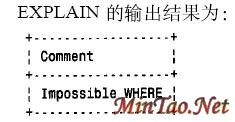 在此情形中,MySQL考察WHERE 子句,如果认识到不可能有满足该查询的行,就不会对该表进行搜索。可利用EXPLAIN 语句知道这一点,EXPLAIN 语句要求MySQL显示某些有关它应该执行一条SELECT 查询,而实际没有执行的信息。为了使用E X P L A I N,只需要SELECT 语句前放置EXPLAIN 即可,如下所示: