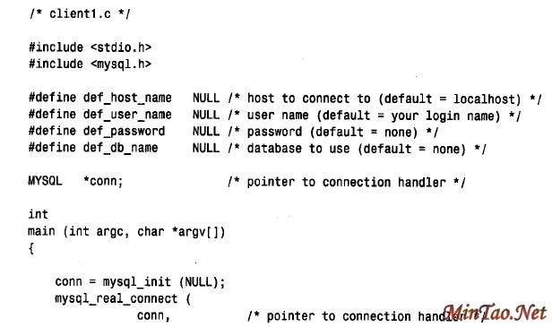 主机名称、用户名称、口令和数据库名称的缺省值固定在代码内部,使事情变得简单。以后,我们将参数化这些值,以便可以在选项文件或命令行中指定它们。程序的main() 函数创建和终止与服务器的连接。建立连接使用如下两个步骤:
