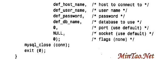 ■ 标志值。因为我们不使用任何特定的连接操作,因此它是0。这个参数可用的选项在附录F 中的mysql_real_connect() 的项目中讨论详细情况。要想终止这个连接,可将连接处理程序的指针传递给mysql_ close()。当将连接处理程序传递mysql_close() 来终止个连接时,由mysql_init() 自动分配的连接处理程序自动地释放。
