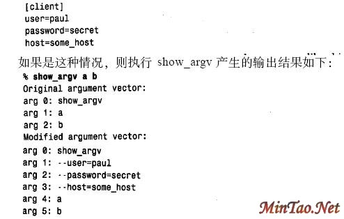 输出结果说明从命令行得到主机名(忽略选项文件中的这个值),从选项文件中得到用户名和口令。getopt_long() 正确分析了选项是在短选项形式( -h host_name )中指定还是在长选项形式( --user = paul ,--password = secret )中指定。