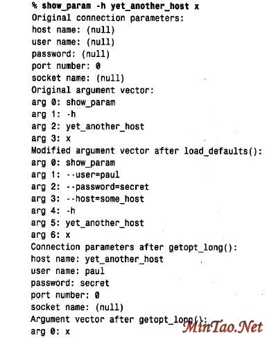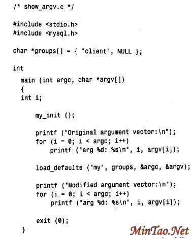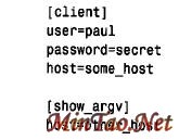 show _ argv打印参数两次,第一次是在命令行指定它们的时候,第二次是在load _ defaults( )修改它们的时候。为了查看load_defaults() 的运行效果,应确信在主目录中有一个具有[client] 组指定设置的. my.cnf 文件。假设. my.cnf 文件如下: