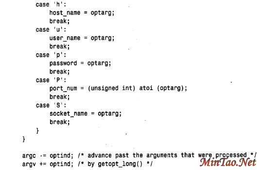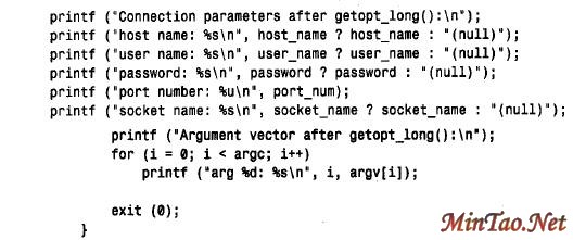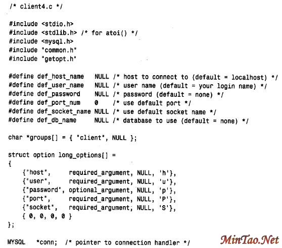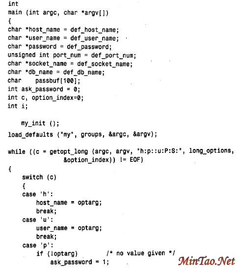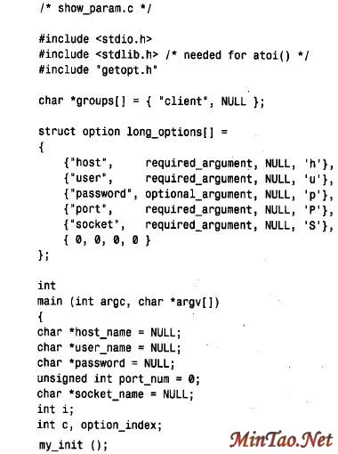 现在我们可以把所有的连接参数都放入参数向量,但需要一个分析该向量的方法。getopt_long() 函数就是为此目的设计的。getopt_long() 设在MySQL客户机库的内部,因此,无论什么时候与库连接都可以访问它。源文件中要包含getopt.h 头文件,可以把这个头文件从MySQL源分发包的include 目录拷贝到正在开发的客户机程序所在的目录中。
