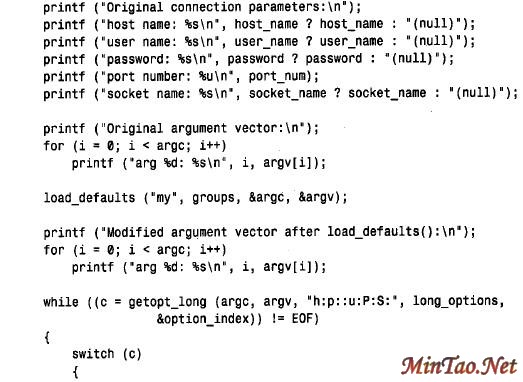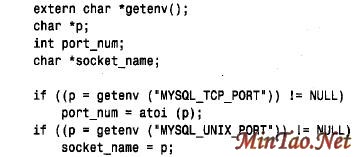 load_defaults() 不是从环境设置中提取值, 如果想使用环境变量的值, 例如MYSQL _ TCP _ PORT 或者MYSQL _ UNIX _ PORT ,就必须使用getenv() 来自己管理。我不想把这个管理能力增加到客户机中,但这里有一个例子,介绍了如何检查几个标准的与MySQL有关的环境变量值: