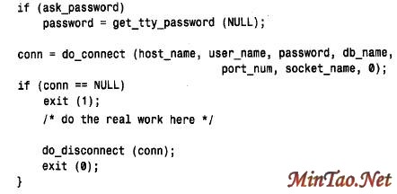 ■ 如果给出没有值的口令选项,则客户机程序提示用户用get_tty_password() 输入口令。在客户机库中,这是一个实用程序,它提示输入口令而不在显示器上回应(客户机库充满了这样吸引人的东西。因为找到了相关的例程和使用它们的方法,所以有助于从MySQL客户机程序的源文件中的读取)。您可能会问:“为什么不只调用getpass( )呢?”回答是,并不是所有的系统都有这个函数,如Windows。get_tty_password() 可以在系统间移植,因为它被配置为适应各种不同系统。