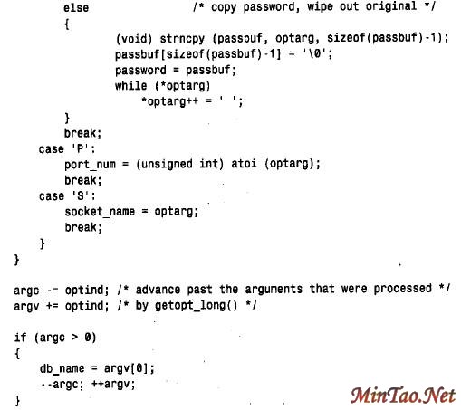 ■ 允许在命令行指定数据库名称,它紧跟在由getopt_long() 分析的选项的后面。这与MySQL分发包中标准客户机的行为是一致的。