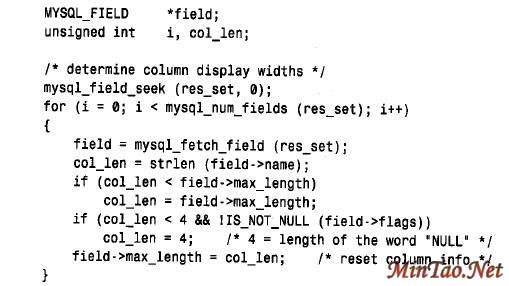 MySQL客户机库提供了访问列信息结构的几种方法,例如,前面样例的代码多次使用如下形式的循环访问这些结构: