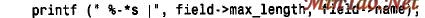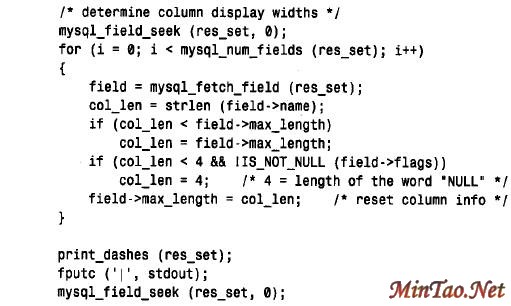 列宽度通过结果集中列的MYSQL_FIELD 结构的迭代来计算,调用mysql_ fetch _ seek( )定位第一个结构,后续的mysql_fetch_field() 调用返回指向连续列的结构的指针。显示出来的列宽度是下面三个值中的最大值,其中每一个都取决于列信息结构中的元数据: