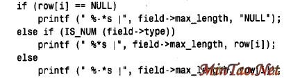 对于数据,我们对结果集中的行进行循环,在每次迭代时打印当前行的列值。从行中打印列值有些技巧,因为值可能是NULL,也可能代表一个数(无论哪种情况都如实打印)。列值的打印如下,这里row[i] 包括数据值和指向列信息的field 指针: