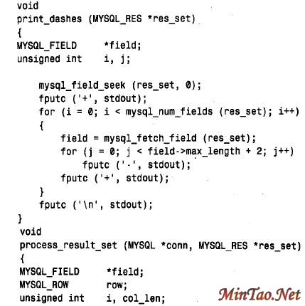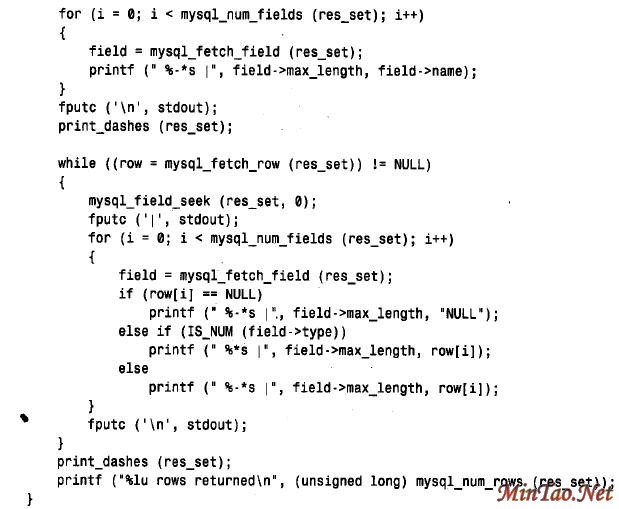 如果field->type 指明的列类型是数字型,如INT、FLOAT或者DECIMAL,那么宏IS _ NUM的值为真。显示该结果集的最终的代码如下所示。注意,因为我们需要多次打印虚线,所以这段代码封装在它自己的函数中,函数print_dashes() 是这样的: