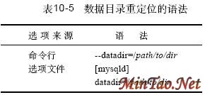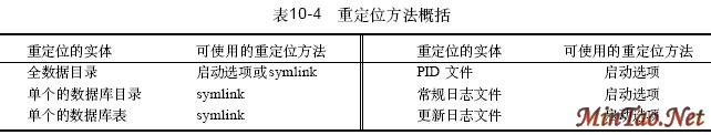 有两种对数据目录重定位的方法: 可以在命令行或在一个选项文件的[mysqld] 组上,在服务器启动时间指定一个选项。 可以移动要重定位的内容,然后在原始的位置中做一个指向新位置的s y m l i n k (symbolic link,符号链接)。 两种方法的任何一种都不能为您进行全部的重定位工作。表10-4 综合了可重定位的内容以及可用于重定位的方法。如果您使用一个选项文件,可以指定在全局选项文件/ e t c / my.cnf(Windows中的c:\my.cnf)中的选项。当前的Windows 版本还访问系统目录(c:\windows 或c:\N T)。 您还可以使用缺省数据目录的选项文件my.cnf(该目录编译在服务器中)。笔者不建议使用此文件。如果要重定位数据目录本身,必须保持缺省数据目录的完整性,以便在数据目录中放置一个选项文件,该文件将说明服务器应该在哪里找到“真正”的数据目录!真乱。如果想要用一个选项文件来指定服务器的选项,则最好使用/ e t c / my.cnf。