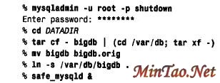 数据库只能通过symlink 方法来移动。为了重定位数据库,应关闭服务器,移动数据库目录。删除原来的数据库目录,用指向新位置的symlink 来代替它,然后启动服务器。 下面的例子说明怎样将数据库bigdb 移动到另一个位置: 重定位的预防措施 在执行任何重定位操作之前应该关闭服务器,然后再重新启动它。对有些类型的重定位(如移动数据库目录),保持服务器的运行状态是可能的(尽管不建议这样做)。如果要这样做,您必须确保服务器没有访问将要移动的数据库。还应该确保在移动数据库之前发布了FLUSH TABLE 语句,以便确保服务器关闭所有打开的表文件。不履行这些预防措施可能导致表的毁坏。 应该以数据目录所有者的身份来执行这些命令。为了安全起见,将原来的数据库目录重新命名为b i g db . o r i g。在验证了服务器与重定位服务器正常工作之后,可以删除原来的目录: % rm -rf bigdb.orig