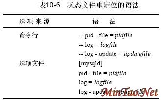 可以用启动选项重定位PID 文件、常规日志和更新日志。错误日志由safe_mysqld 创建且不能够重定位(除非编辑s a f e _ mysqld) 为了在另一个位置写状态文件,应关闭服务器,然后用指定新状态文件位置的恰当选项重新启动它。表10 - 6列出了每个文件的命令行和选项的语法。 删除一个重定位的数据库 您可以用DROP DATABASE 语句删除一个数据库,但是旧版本的MySQL在删除已经重定位的数据库时是有难度的。该数据库中的表被正确地删除了,但在服务器试图删除该数据库目录时会出现错误,这是由于该目录是一个symlink 而不是真正的目录。MySQL管理员必须手工删除该数据库目录和指向它的s y m l i n k。自MySQL3.23 以来,这个问题已经得到解决。 如果以绝对路径名指定一个状态文件的名称,则用该路径名创建该文件。否则,该文件在该数据目录下创建。例如,如果您指定- - pid - file = /var/run/mysqld.pid,则该PID 文件为/ v a r / r un / mysqld . p i d。如果您指定-- pid - file = mysqld.pid ,则该PID 文件为DATA D I R/ mysqld . p i d。 如果指定一个没有带扩展名的更新日志,则MySQL在打开该更新日志时将生成顺序的名字。这些名字用. n n n 扩展名创建,这里的.n n n是未被已有的更新日志文件使用过的第一个号码(如, up date . 0 0 1、up date . 0 0 2等等)。可以通过指定包含明确的扩展名来忽略顺序名字的生成,然后服务器将仅使用您指定的这个名字。