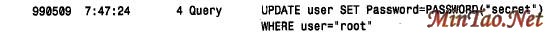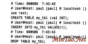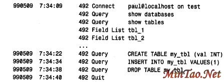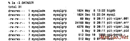 服务器在启动时将它的进程ID(PID )写入PID 文件,并在关闭时删除该文件。PID 文件是一种方法,用这种方法,其他的进程可以找到该服务器。例如,如果您在系统关闭时运行mysql.server 脚本来关闭MySQL服务器,则该脚本将检查PID 文件以确定它需要哪个进程来发送一个终止信号。 错误日志由safe_mysqld 产生,作为服务器标准错误输出结果的重定向,它包含服务器写入stderr 的所有消息。这意味着仅当通过调用safe_mysqld 启动服务器时,错误日志才存在(总之,这是启动服务器的首选方法,因为,如果由于一个错误使错误日志存在,则s a f e _ mysqld将重新启动服务器) 常规日志和更新日志是可选的,可以用--log 和--log-update 服务器选项开启需要的日志类型。 常规进程提供有关服务器运作的常规信息:谁从哪里进行了连接,以及他们发布了什么查询。更新日志也提供查询信息,但仅仅是修改过的数据库内容的查询信息。更新日志的内容是一些SQL 语句,这些语句可以通过将它们输入到mysql客户机程序来运行。如果出现崩溃且必须转到备份文件时,更新日志将是有用的,因为您能够通过将更新日志输入到服务器来重复这些自崩溃以来所完成的更新操作。这将使得数据库恢复到崩溃发生时所处的状态上。 下面是一个实例,它是作为一个短客户机会话的结果出现在常规日志中的信息中的,这个会话在test 数据库中创建一个表,并插入一行到该表中,然后删除该表: 常规日志包含日期和时间、服务器线程ID、事件类型以及特定事件信息的列。 同一个会话出现在如下的更新日志中: 对于更新日志,日志的扩展格式是可用的,即使是用--log - long - format 选项。扩展的日志提供有关谁何时发布查询的信息。当然,这将使用更多的磁盘空间,但是,如果您不将更新日志的内容与常规日志中的连接事件相联系就想知道谁正在做什么的话,扩展日志或许是可用的。 对于刚才显示出的会话,扩展日志将产生下列信息: 确保日志文件的安全且不被用户任意读取是个好注意。常规日志和更新日志都包含有诸如口令这样的敏感信息,这是因为它们包含了查询的文本。下面是您不想让任何人都能读取的日志项,因为它显示了root 用户的口令: 有关检查可设置数据目录许可权的信息,请参阅第12 章。数据目录安全的简短指令由下列命令组成: % chmod 700 DATADIR 以拥有该数据目录的UNIX 用户身份来运行此命令。还要确保服务器以该用户身份运行,否则此命令不仅将其他用户排斥在该数据目录之外(您想要的),还将阻止服务器访问您的数据库(您不要的)。 状态文件出现在数据目录的最高级,就像数据库目录一样,因此您可能会想到那些文件的名字是否会相互混淆或者被误认为是数据库名(例如,当服务器正在执行S H O W DATABASE 语句时)。答案是:不会的。状态和日志信息存储在文件中,而数据库是目录,因此可执行程序可以将它们与一个简单的stat() 调用相区别(是服务器告诉它们怎样区分的)。如果您正在监视数据目录,则可以通过使用ls -l 将状态文件从数据库目录中区分开来,并且检查该模式信息的第一个字符以查看它是‘ -’还是‘d’: 您还可以通过查看名字而简单地告之:所有状态文件名都包含一个句点,但是数据库目录名没有句点(句点不是数据库名的合法字符)。 有关日志文件维护和循环技术的信息,请参阅第11章的内容。