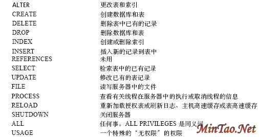 GRANT 语句的语法如下: GRANT privileges (columns) ON what TO user IDENTIFIEDBY "password" WITH GRANT OPTION 要使用该语句,需要填写以下部分: privileges 分配给用户的权限。下表列出了可在GRANT 语句中使用的权限说明符: 权限说明符权限允许的操作 上表显示的第一组权限说明符适用于数据库、表和列。第二组说明符是管理特权。通常,这些权限的授予相当保守,因为它们会影响服务器的操作(例如, SHUTDOWN 特权不是按每天来分发的权限)。第三组说明符是特殊的。ALL 的意思是“所有的权限”,而USAGE 的 意思是“无权限”─即创建用户,但不授予任何的权限。 columns 权限适用的列。这是可选的,只来设置列专有的权限。如果命名多于一个列,则用逗号分开。 what 权限应用的级别。权限可以是全局的(适用于所有数据库和所有的表)、数据库专有的(适用于某个数据库中的所有表),或表专有的。可以通过指定一个C O L U M N S子句将权限授予特定的列。 user 使用权限的用户。它由用户名和主机名组成。在MySQL中,不仅指定谁进行连接,还要指定从哪里连接。它允许您拥有两个带有相同名字的、从不同位置连接的用户。MySQL允许在它们之间进行区别并相互独立地分配权限。 MySQL的用户名就是您在连接到服务器时指定的名字。该名字与您的UNIX 注册名或Windows 名的没有必然连系。缺省设置时,客户机程序将使用您注册的名字作为MySQL的用户名(如果您不明确指定一个名字的话),但这只是一个约定。有关将root 作为可以 操作一切MySQL的超级用户名也是这样,就是一种约定。您也可以在授权表中将此名修改成n o b o d y,然后作为nobody 用户进行连接,以执行需要超级用户特权的操作。 password 分配给该用户的口令。这是可选的。如果您不给新用户指定IDENTIFIEDBY子句,该用户不分配口令(是非安全的)。对于已有的用户,任何指定的口令将替代旧口令。如果不指定新口令,用户的旧口令仍然保持不变。当您确实要使用ID E N T I F I E DBY 时,该口令串应该是直接量,GRANT 将对口令进行编码。当用SET PA S S W O R D语句时,不要使用PASSWORD() 函数。 WITH GRANT OPTION 子句是可选的。如果包含该子句,该用户可以将GRANT 语句授予的任何权限授予其他的用户。可以使用该子句将授权的能力授予其他的用户。 用户名、口令以及数据库和表的名称在授权表项中是区分大小写的,而主机名和列名则不是。 通过查询某些问题,通常可以推断出所需的GRANT 语句的类型: 谁可以进行连接,从哪里连接? 用户应具有什么级别的权限,这些权限适用于什么? 允许用户管理权限吗? 让我们来提问这些问题,同时看一些利用GRANT 语句设置MySQL用户账号的例子。 1. 谁可以进行连接,从哪里连接 您可以允许用户在特定的主机或涉及范围很宽的一组主机中进行连接。在一个极端,如果知道用户将仅从那个主机中进行连接,则可限定对单个主机的访问: GRANT ALL ON samp_db.* TO boris@localhost IDENTFIEDBY "ruby" GRANT ALL ON samp_db.* TO fred@ares.mars.net IDENTFIEDBY "quartz" (符号samp_db.* 含义是“在samp_db 数据库中的所有表”)在另一个极端,您可能会有一个用户m a x,他周游世界并需要能够从世界各地的主机中进行连接。在这种情况下,无论他从哪里连接您都将允许: GRANT ALL ON samp_db.* TO max@% IDENTFIEDBY "diamond" ‘%’字符起通配符的作用,与LIKE 模式匹配的含义相同,在上个语句中,它的意思是“任何主机”。如果您根本不给出主机名部分,则它与指定“ %”的含义相同。因此, max 和max@% 是等价的。这是设置一个用户最容易的方法,但安全性最小。 要想采取妥协的办法,可允许用户在一组有限的主机中进行连接。例如,要使mary 从snake.net 域的任何主机中进行连接,可使用%.snake.net 主机说明符: GRANT ALL ON samp_db.* TO mary@%.snake.net IDENTFIEDBY "topaz" 该用户标识符的主机部分可用IP 地址而不是主机名给出(如果愿意的话)。可以指定一个直接的IP 地址或包含模式字符的地址。同样,自MySQL3.23 起,可以用一个网络掩码来指定IP 号,网络掩码表明了用于该网络号的二进制位数: GRANT ALL ON samp_db.* TO joe@192.168.0.3 IDENTIFIEDBY "water" GRANT ALL ON samp_db.* TO ardis@192.168.128.% IDENTIFIEDBY "snow"