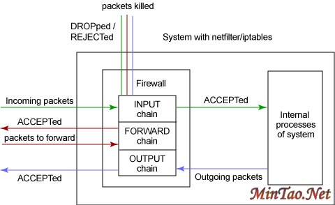 如果信息包源自外界并前往系统,而且防火墙是打开的,那么内核将它传递到内核空间信息包过滤表的 INPUT 链。如果信息包源自系统内部或系统所连接的内部网上的其它源,并且此信息包要前往另一个外部系统,那么信息包被传递到 OUTPUT 链。类似的,源自外部系统并前往外部系统的信息包被传递到 FORWARD 链。