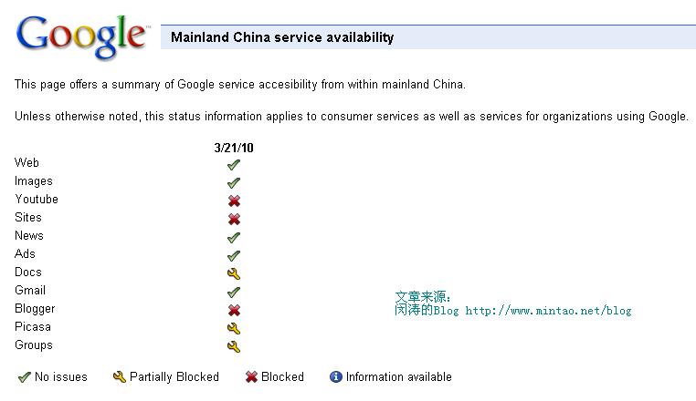 从某些迹象表明谷歌还是不太情愿放弃中国互联网这块大蛋糕的,于是在撤出内地的同时谷歌还推出了一项新的监视服务,以报告海外Google服务在中国大陆是否可以访问http://www.google.com/prc/report.html 。