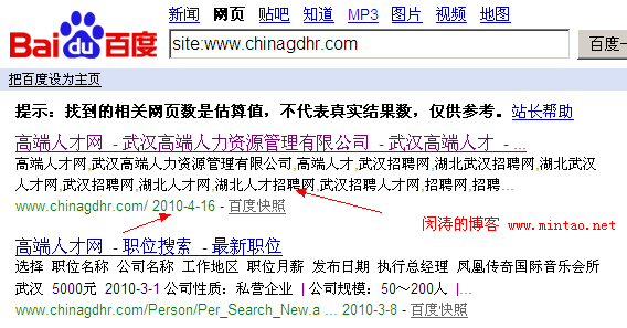 高端人才网是武汉高端人力资源管理有限公司旗下的一个人才网站,原名是“中国高端人才网”,这个人才网站的网址是http://www.chinagdhr.com ,启用这个www.chinagdhr.com这个域名已经有七个多月了,以前搜索“高端人才网”这个关键词时一直都是很好的,但是最近在百度搜索“高端人才网”这个关键词时却发现明显下降了不少,掉到了第一页的第九名,高端人才网的首页不是很新,今天是4月26号,快照却是4月16号的,不是很新,也许这是影响排名的一个因素吧:
