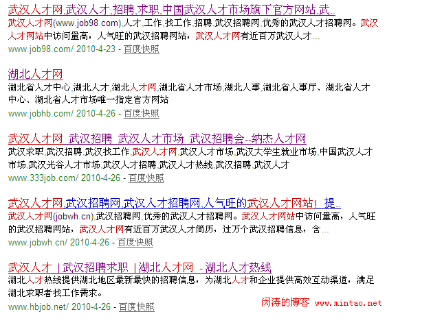 总结:关于网站优化是一个长期的过程,而网站标题却是一个很重要的一步,也是决定网站能否成功的重要原因,高端人才网要成功的做好排名优化,必须要不断地努力改进各方面的优化,今天就先谈网站标题的优化了,下一讲闵涛将会讲讲网站首页和内页的关键词设置方面的内容。欢迎大家访问闵涛的博客(http://www.mintao.net/blog)来查看闵涛的最新博客文章,也请您在百忙之中给闵涛一些意见和参考,谢谢。